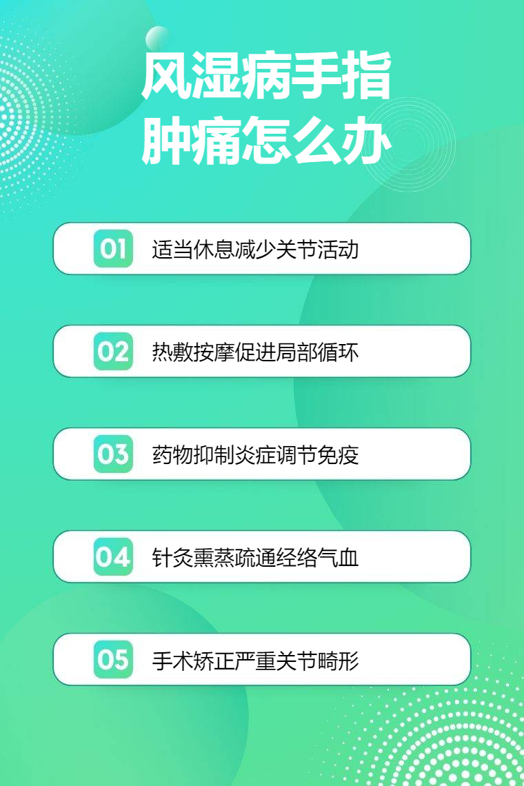 4. 中医治疗:中医针灸通过刺激手指关节周围穴位,调节人体经络气血运行,激发人体自身的调节功能,改善局部血液循环,减轻炎症,从而缓解风湿病引起的手指肿痛。中药熏蒸利用中药蒸汽的温热和药力作用,使药物透过皮肤直达病所,起到温通经络、散寒除湿、消肿止痛的效果。