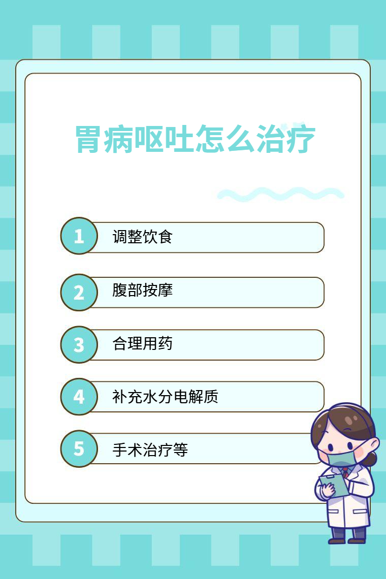胃病呕吐的治疗方法包括调整饮食、腹部按摩、合理用药、补充水分电解质、手术治疗等。