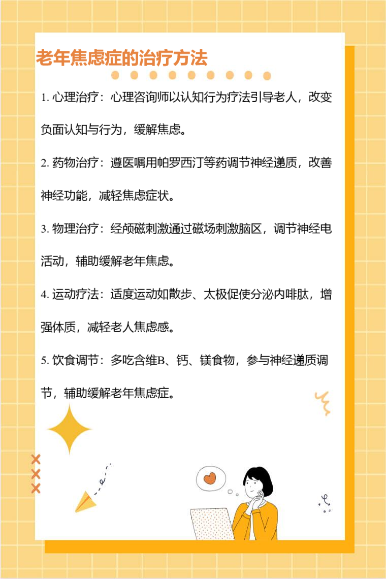 老年焦虑症的治疗方法主要有心理治疗、药物治疗、物理治疗、运动疗法、饮食调节等。