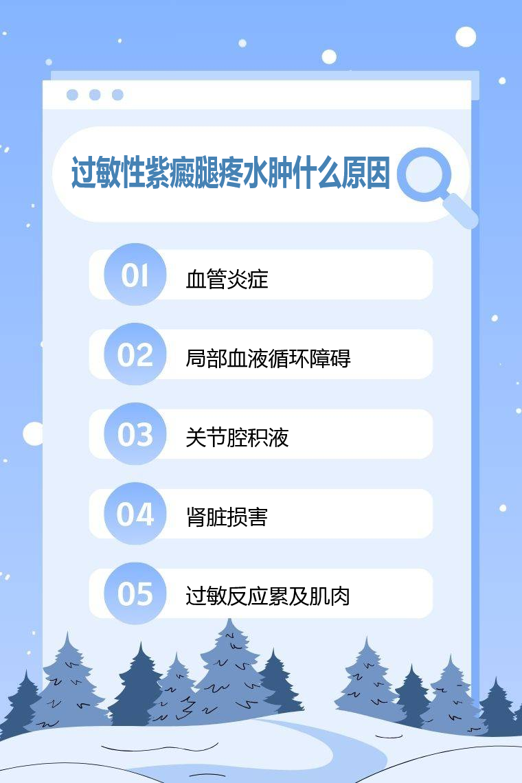 过敏性紫癜腿疼水肿的原因包括血管炎症、局部血液循环障碍、关节腔积液、肾脏损害、过敏反应累及肌肉等。