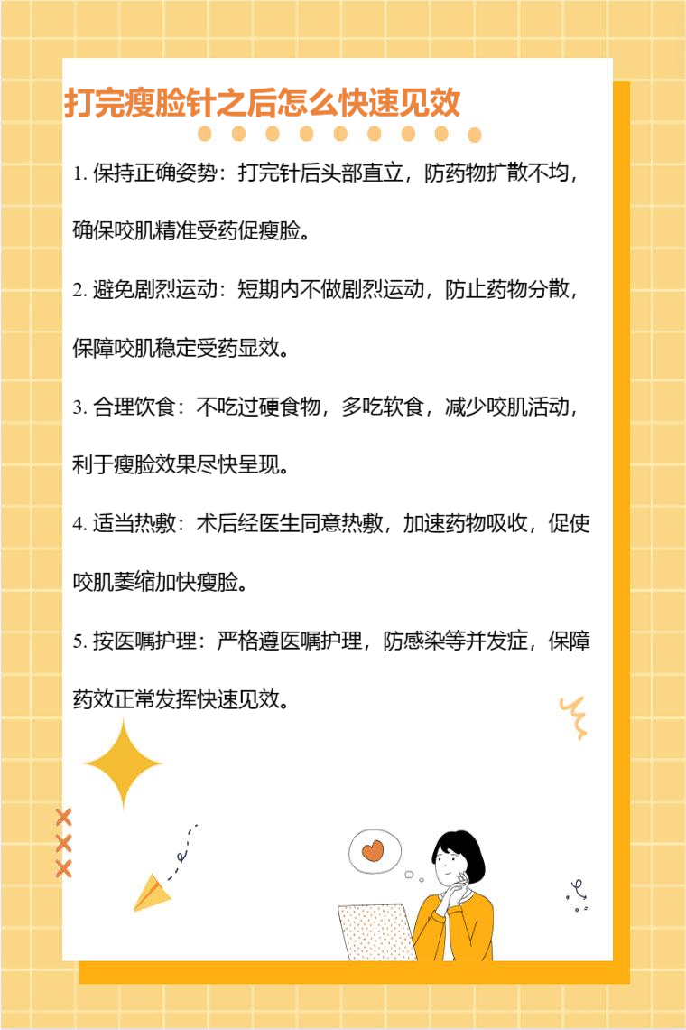 打完瘦脸针之后可通过保持正确姿势、避免剧烈运动、合理饮食、适当热敷、按医嘱护理等快速见效。