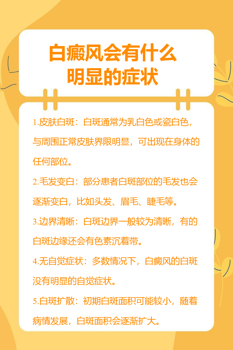 白癜风的明显症状有皮肤白斑、毛发变白、边界清晰、无自觉症状、白斑扩散等。
