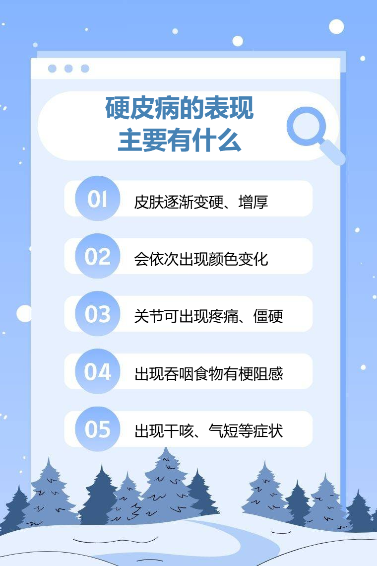 1. 皮肤硬化:初期皮肤可能出现肿胀,随后逐渐变硬、增厚,失去弹性,常见于手指、面部、颈部等部位,严重时会影响肢体活动,外观上皮肤紧绷发亮。
