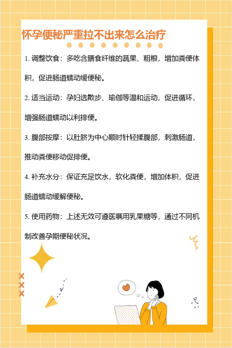 怀孕便秘严重拉不出来可通过调整饮食、适当运动、腹部按摩、补充水分、使用药物等方法治疗。
