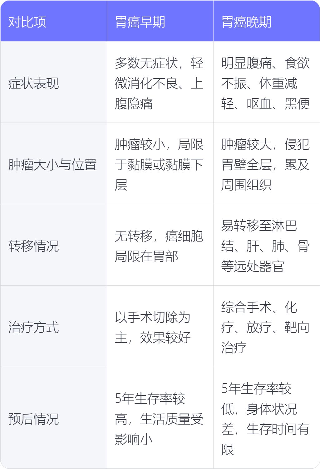 胃癌早期与晚期在症状表现、肿瘤大小与位置、转移情况、治疗方式、预后情况上存在不同。