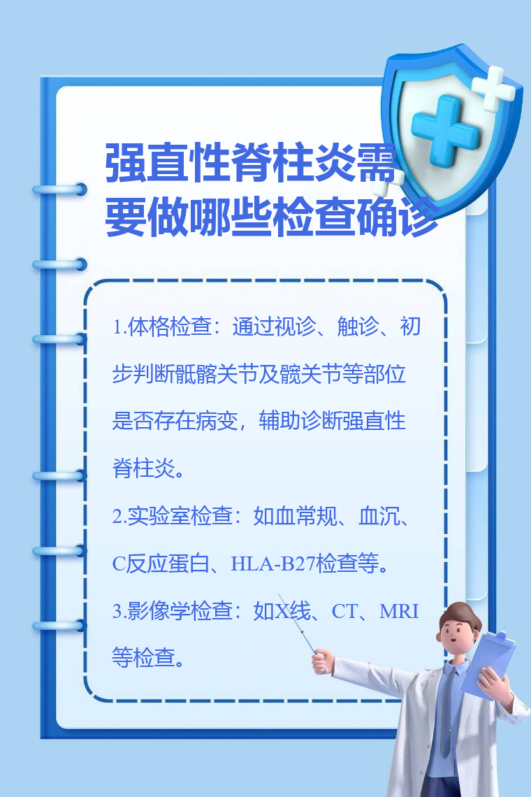 强直性脊柱炎需要做体格检查、实验室检查、影像学检查等。