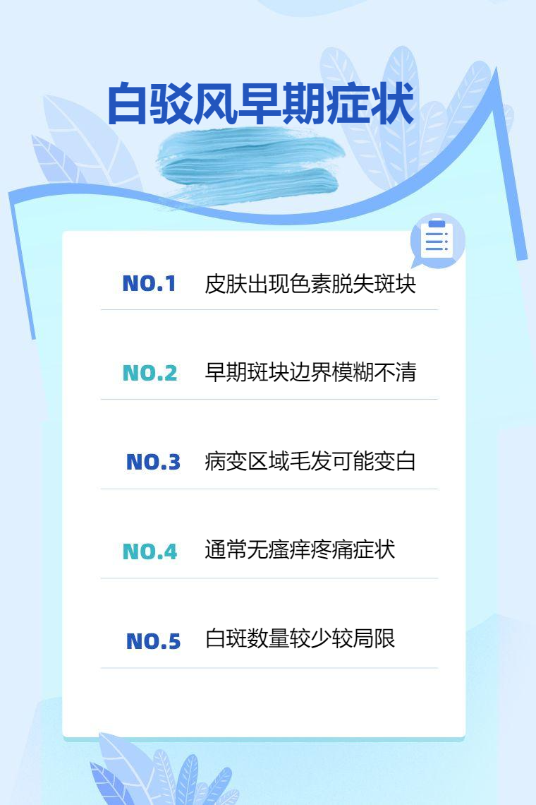 1. 皮肤白斑:白驳风早期通常在皮肤上出现大小不一、形态各异的白斑,多呈圆形、椭圆形或不规则形,可出现在身体任何部位,常见于暴露及易摩擦部位,如面部、颈部、手部等。