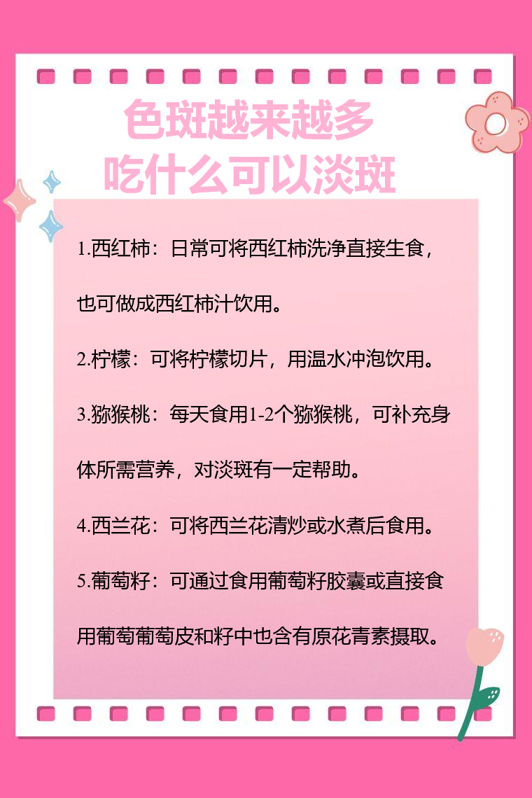 色斑越来越多可以吃西红柿、柠檬、猕猴桃、西兰花、葡萄籽等帮助淡斑。