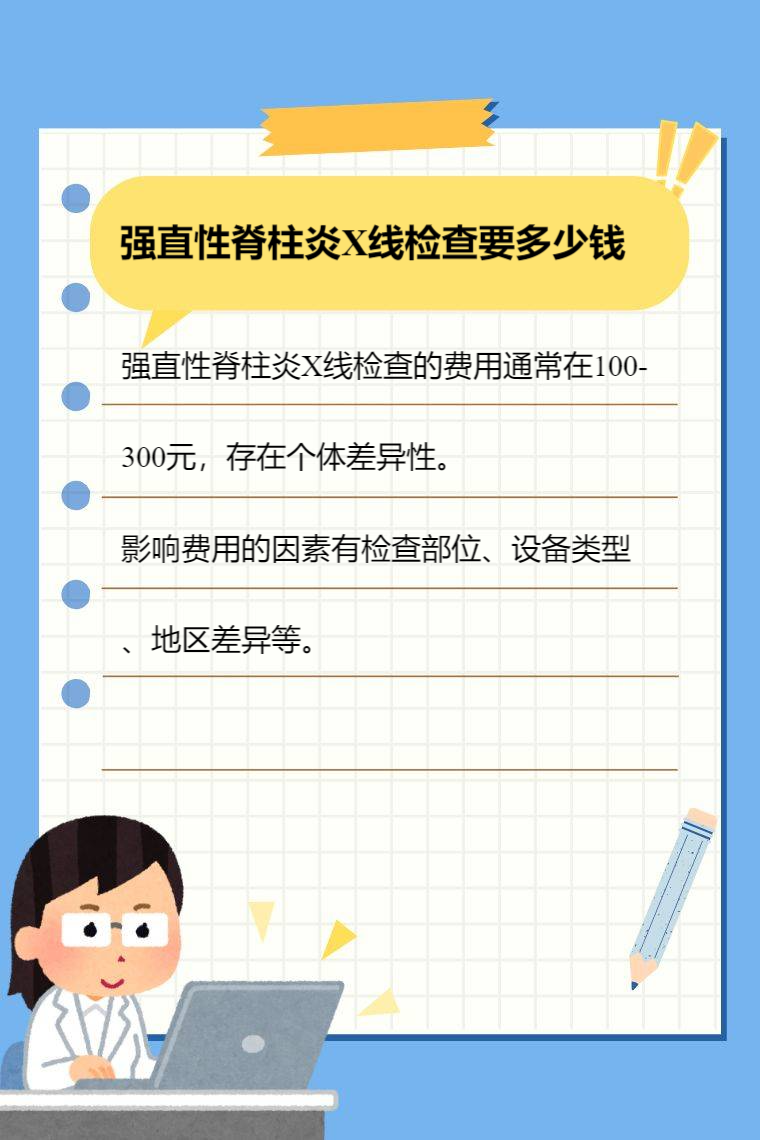 强直性脊柱炎X线检查的费用通常在100-300元,存在个体差异性。影响费用的因素有检查部位、设备类型、地区差异等。