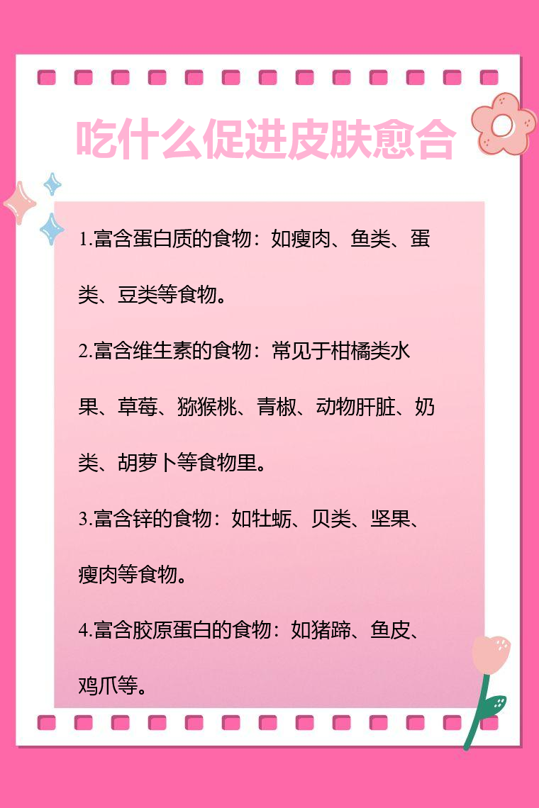 富含蛋白质的食物、富含维生素的食物、富含锌的食物、富含胶原蛋白的食物等可促进皮肤愈合。