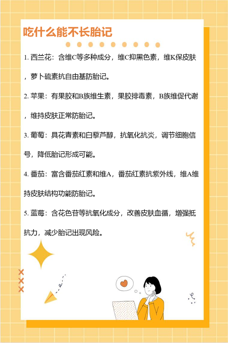 西兰花、苹果、葡萄、番茄、蓝莓等食物或有助于减少胎记形成。