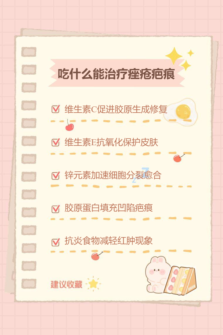 富含维生素C的食物、富含维生素E的食物、富含锌的食物、胶原蛋白丰富的食物、具有抗炎功效的食物等对治疗痤疮疤痕有一定帮助。