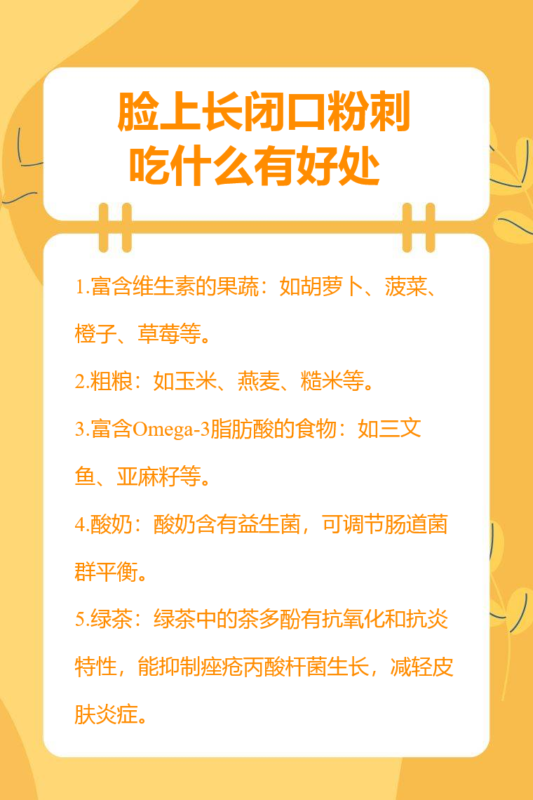 长闭口粉刺的人一般吃富含维生素的果蔬、粗粮、富含Omega-3脂肪酸的食物、酸奶、绿茶等有好处。