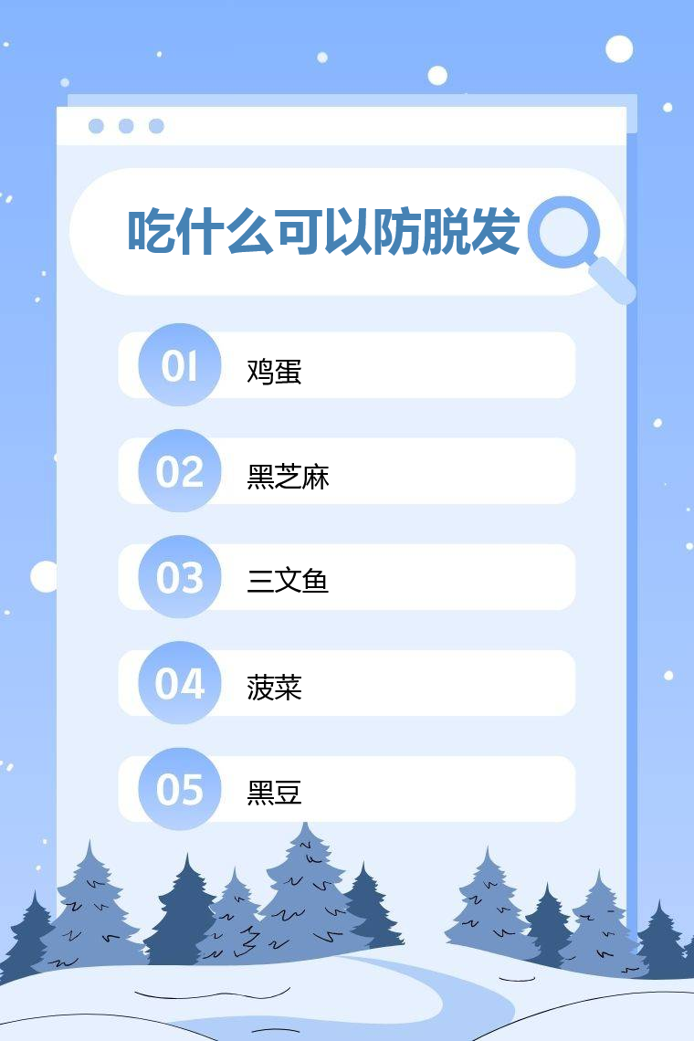 吃鸡蛋、黑芝麻、三文鱼、菠菜、黑豆等可在一定程度上起到防脱发的作用。