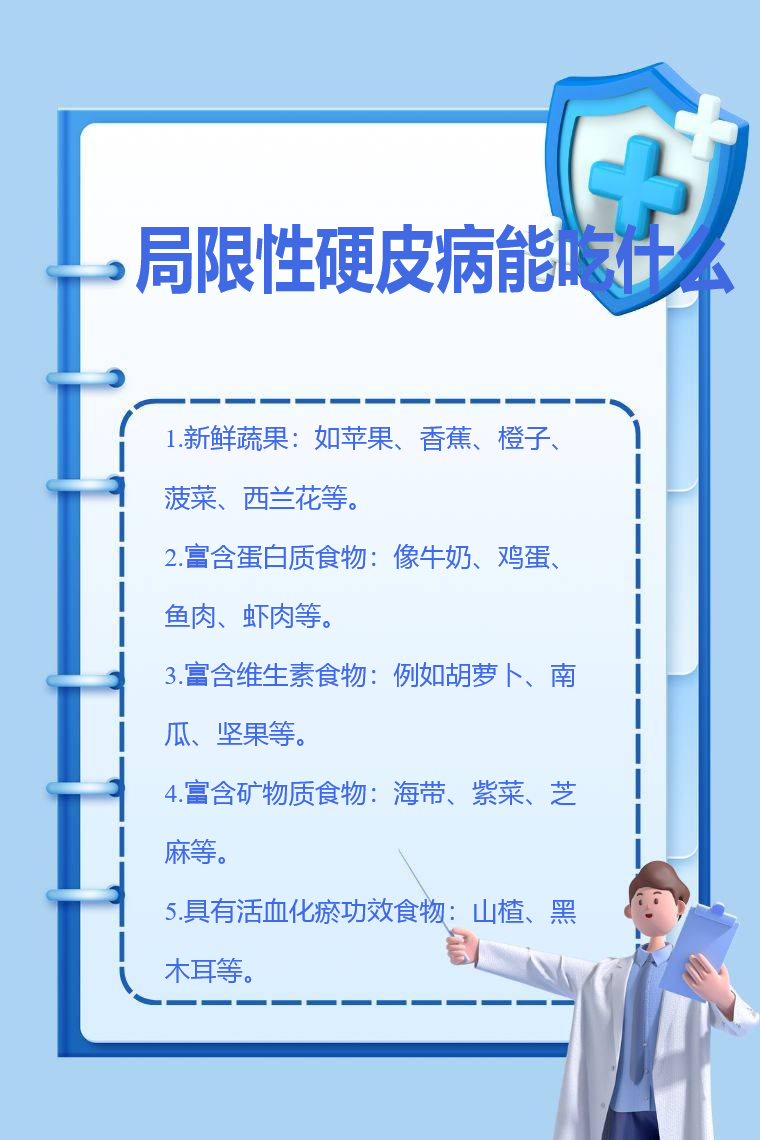 局限性硬皮病患者可食用新鲜蔬果、富含蛋白质食物、富含维生素食物、富含矿物质食物、具有活血化瘀功效食物等。