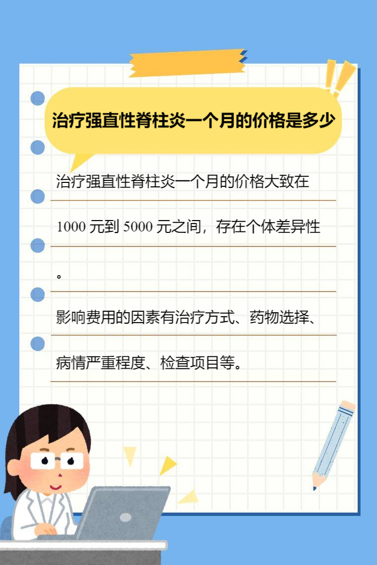 治疗强直性脊柱炎一个月的价格因多种因素而异,大致在 1000 元到 5000 元之间,存在个体差异性。影响费用的因素有治疗方式、药物选择、病情严重程度、检查项目等。
