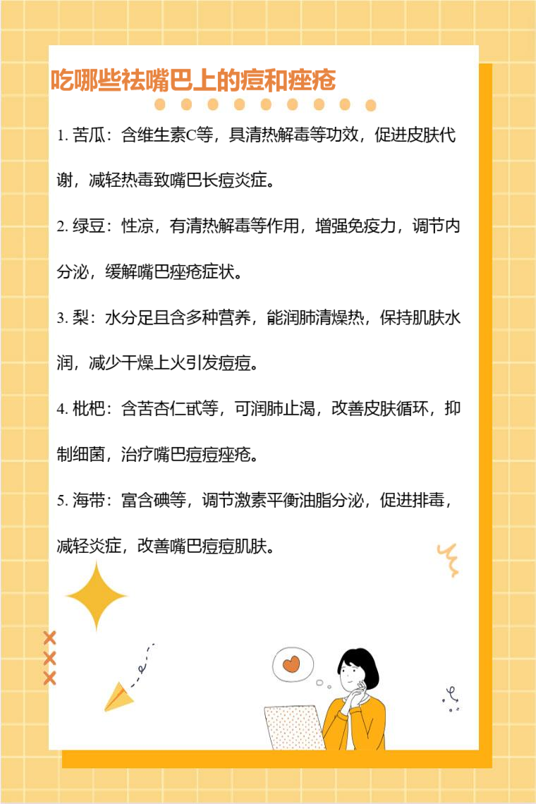 苦瓜、绿豆、梨、枇杷、海带等食物有助于祛嘴巴上的痘和痤疮。