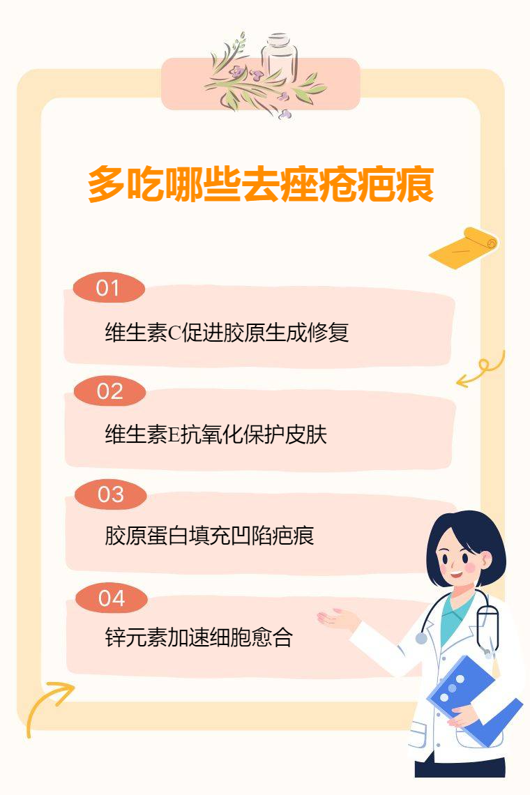 多吃富含维生素C的水果、富含维生素E的食物、富含胶原蛋白的食物、富含锌的食物等有助于去除痤疮疤痕。