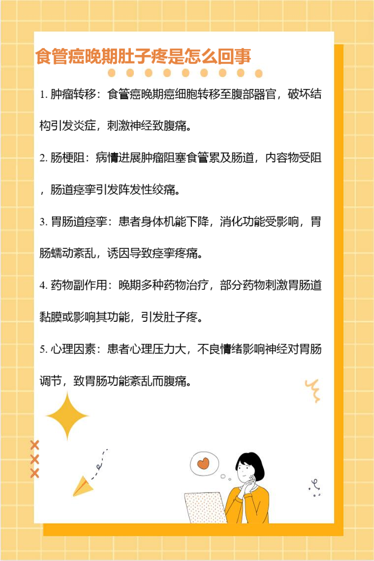 食管癌晚期肚子疼可能是由肿瘤转移、肠梗阻、胃肠道痉挛、药物副作用、心理因素等引起。