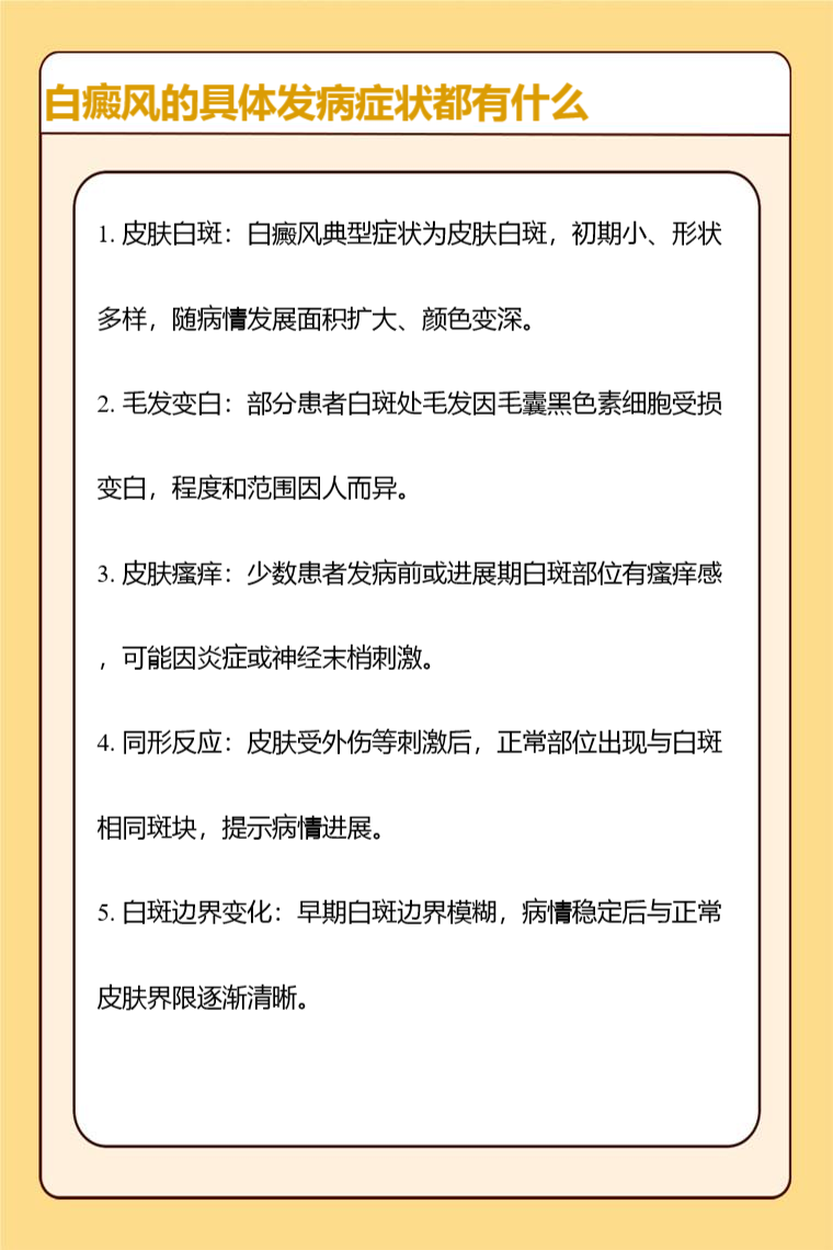 白癜风的具体发病症状有皮肤白斑、毛发变白、皮肤瘙痒、同形反应、白斑边界变化等。