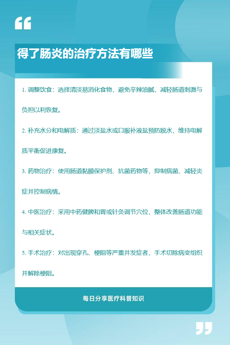 得了肠炎的治疗方法有调整饮食、补充水分和电解质、药物治疗、中医治疗、手术治疗等。