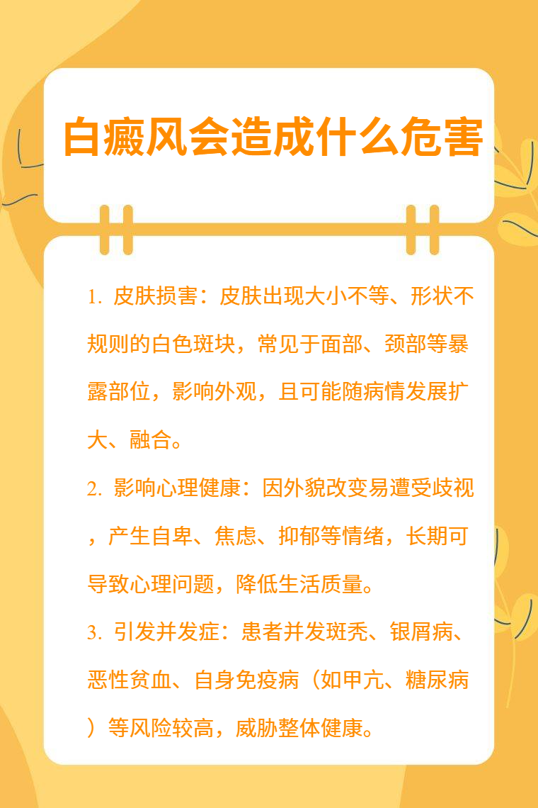 白癜风会造成皮肤损害、影响心理健康、引发并发症等危害。