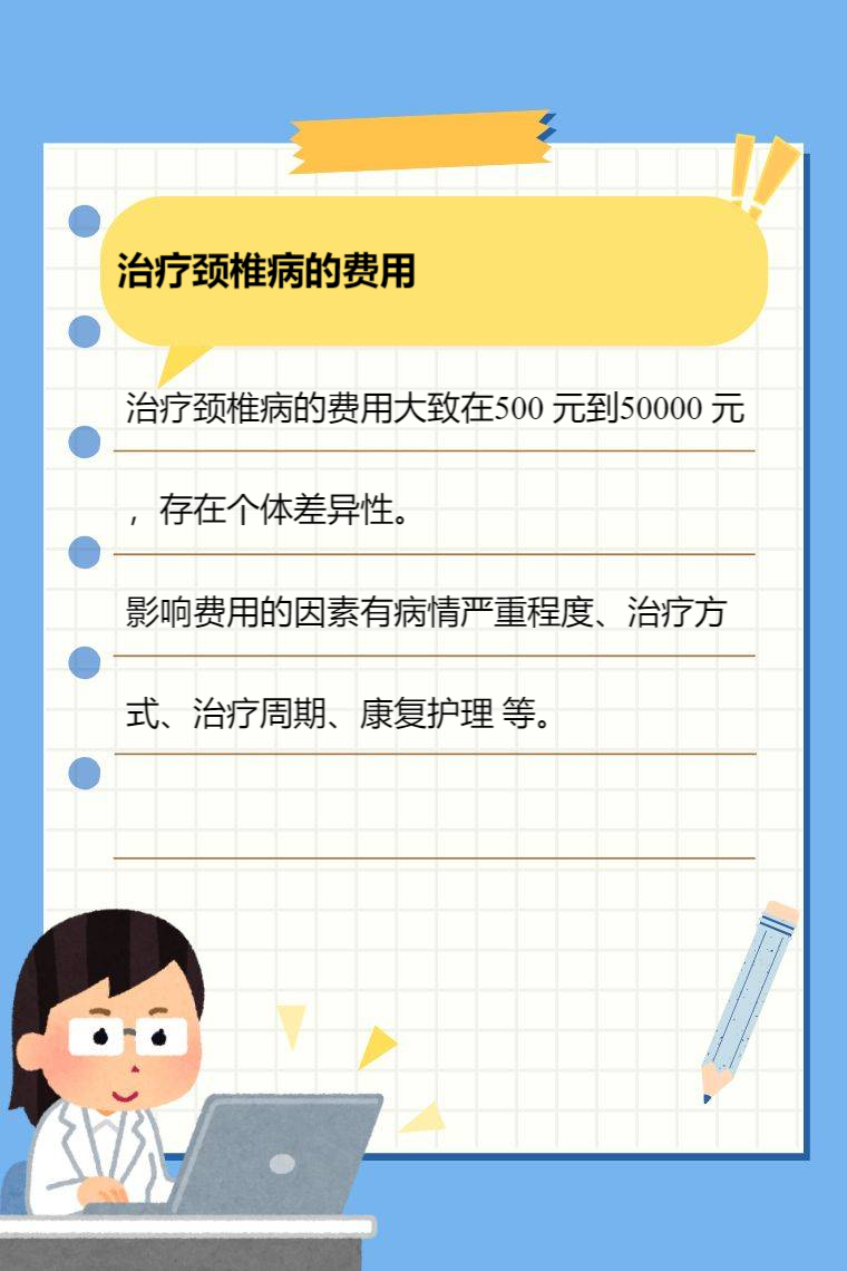 治疗颈椎病的费用因多种因素而异。价格区间大致在 500 元到 50000 元,存在个体差异性。影响费用的因素有病情严重程度、治疗方式、治疗周期、康复护理 等。