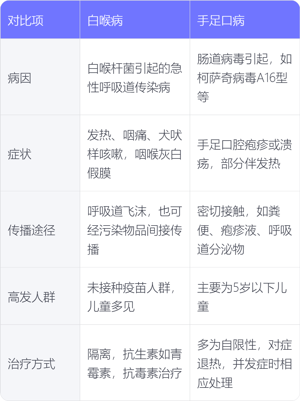 白喉病与手足口病在病因、症状、传播途径、高发人群、治疗方式上存在不同。