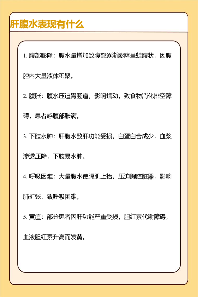 肝腹水表现有腹部膨隆、腹胀、下肢水肿、呼吸困难、黄疸等。