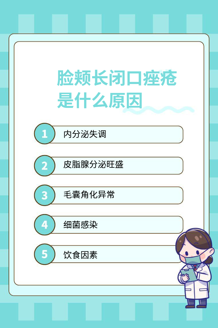 脸颊长闭口痤疮常见原因有内分泌失调、皮脂腺分泌旺盛、毛囊角化异常、细菌感染、饮食因素等。