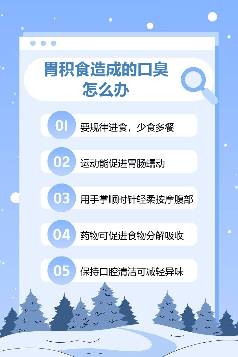 胃积食造成的口臭可通过饮食调整、适当运动、腹部按摩、药物治疗、口腔清洁等方法来缓解。