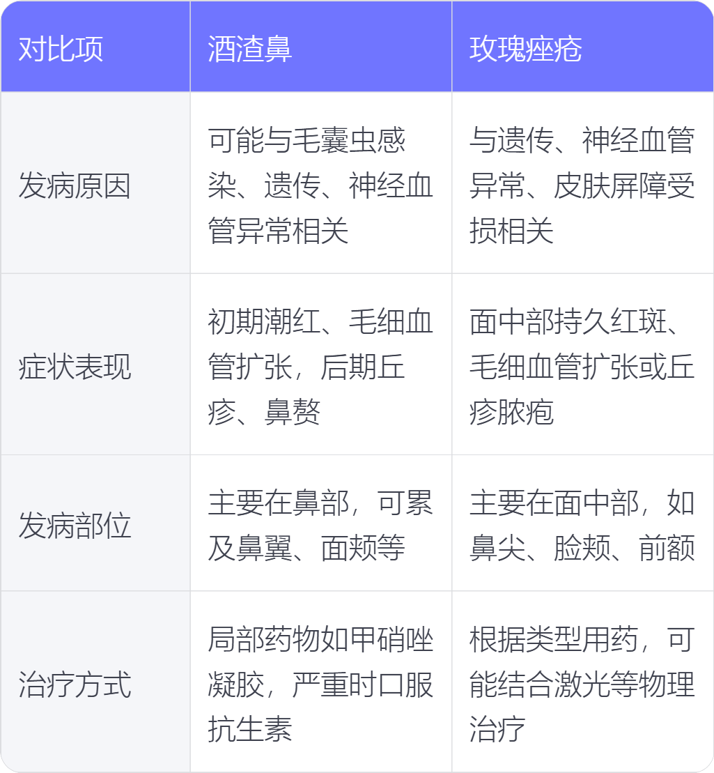 酒渣鼻和玫瑰痤疮在发病原因、症状表现、发病部位、治疗方式上存在不同。