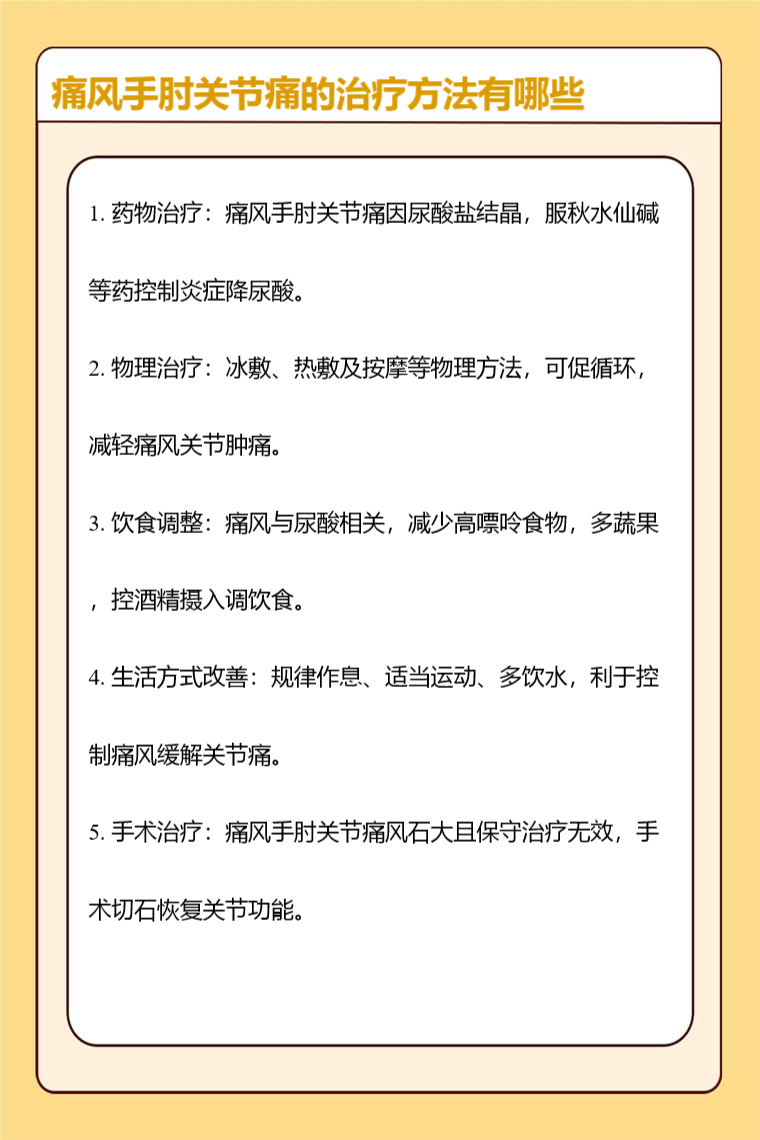 痛风手肘关节痛的治疗方法有药物治疗、物理治疗、饮食调整、生活方式改善、手术治疗等。