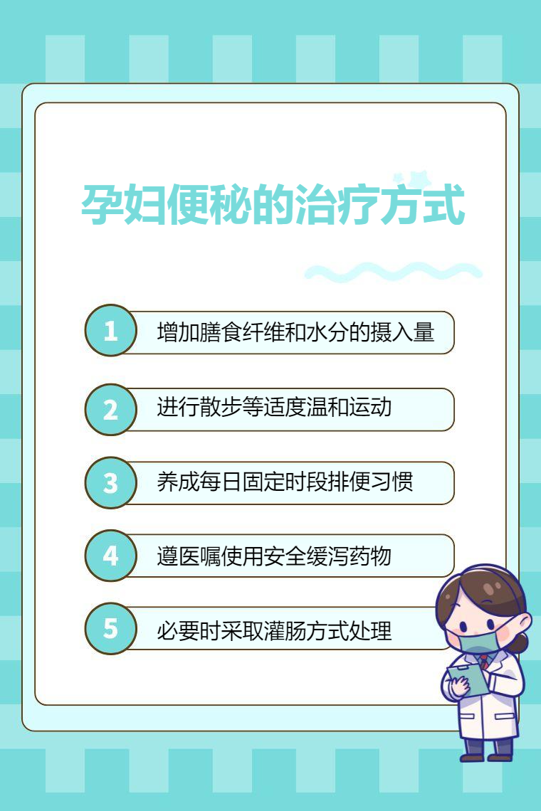 孕妇便秘的治疗方式主要有调整饮食结构、增加运动量、培养良好排便习惯、使用缓泻剂、灌肠等。