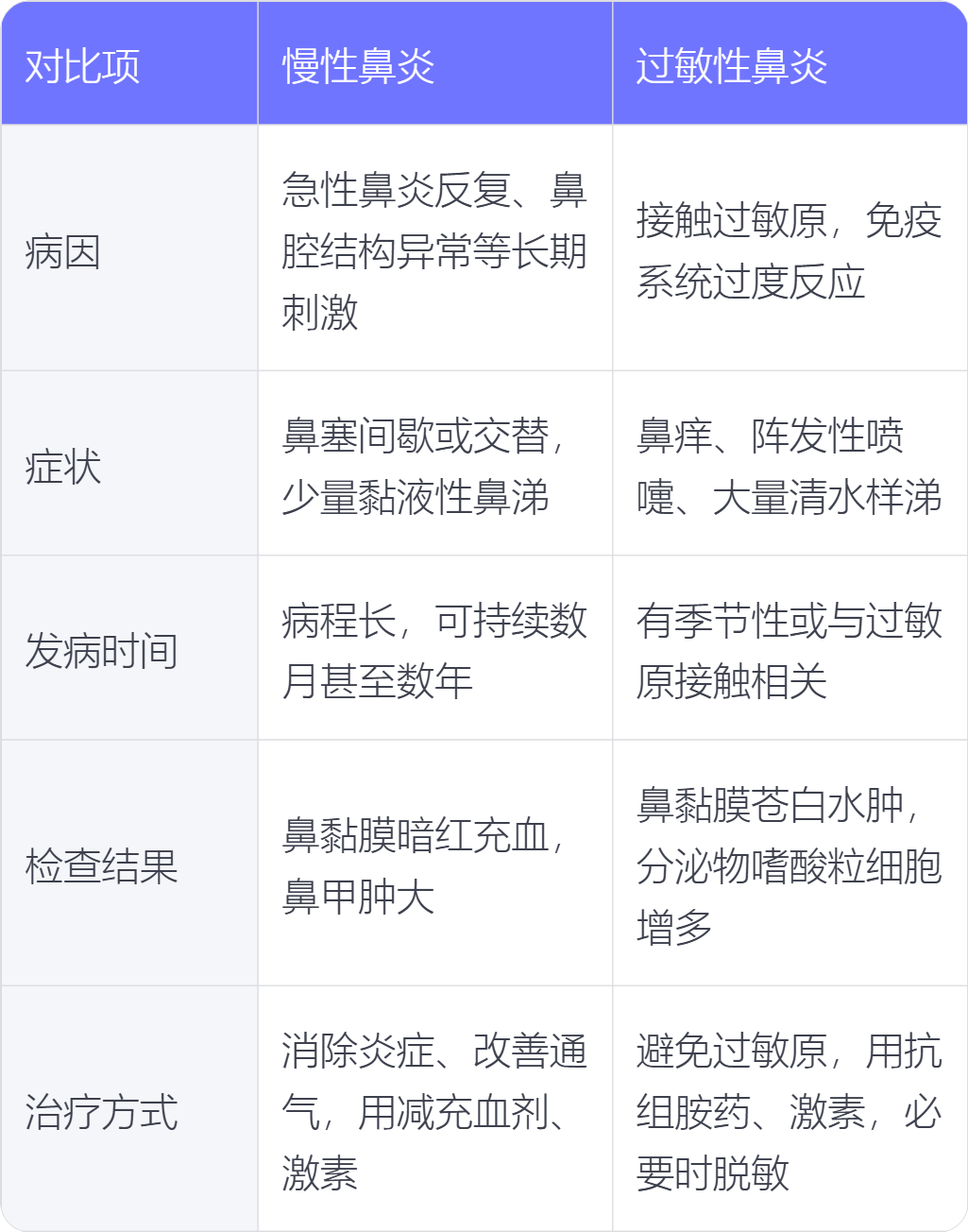 慢性鼻炎和过敏性鼻炎可从病因、症状、发病时间、检查结果、治疗方式来区分。