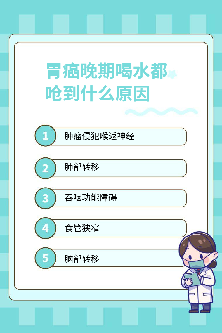 胃癌晚期喝水都呛到可能是由于肿瘤侵犯喉返神经、肺部转移、吞咽功能障碍、食管狭窄、脑部转移等。