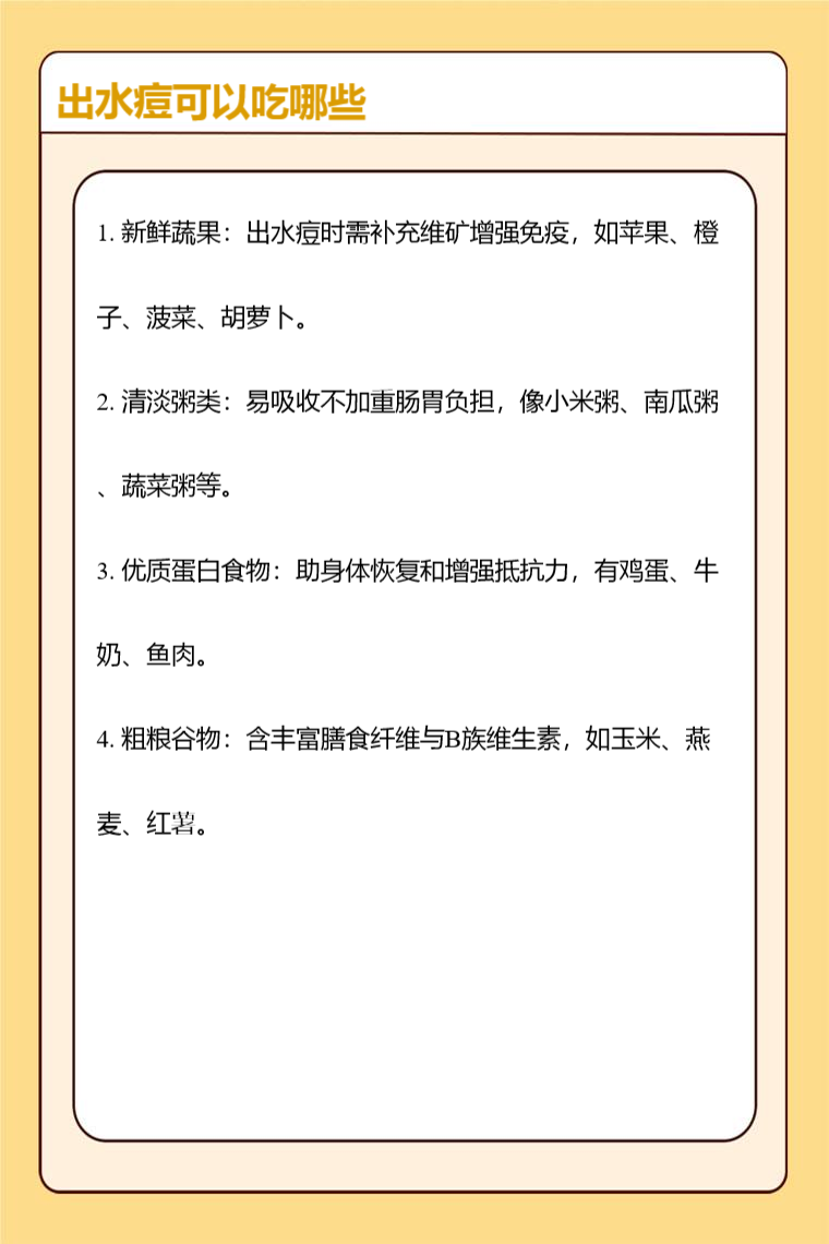 出水痘可吃的食物有新鲜蔬果、清淡粥类、优质蛋白食物、粗粮谷物等。