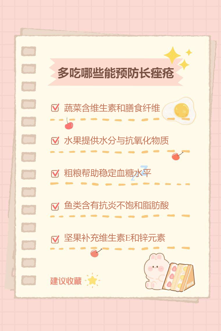 多吃蔬菜、水果、粗粮、鱼类、坚果等能预防长痤疮。