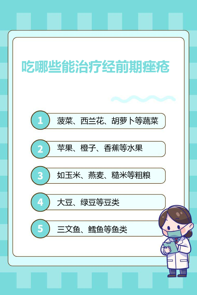 吃蔬菜、水果、粗粮、豆类、鱼类等能在一定程度上辅助改善经前期痤疮。