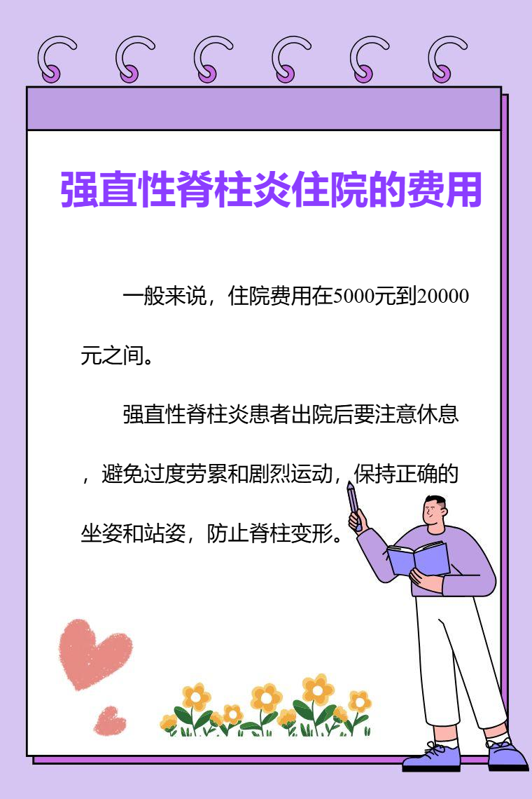 强直性脊柱炎住院费用因多种因素而异。一般来说,住院费用在5000元到20000元之间,存在个体差异性。影响费用的因素有病情严重程度、治疗方式、住院时长、药物使用 等。
