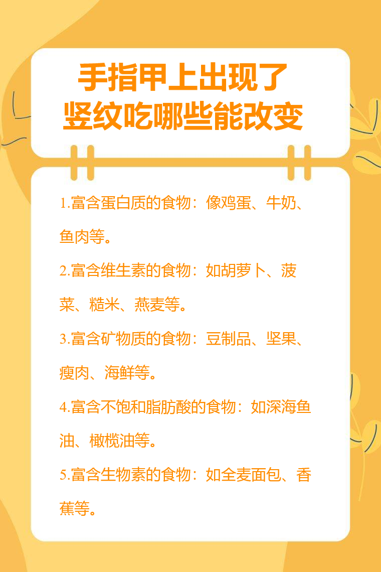 富含蛋白质、维生素、矿物质、不饱和脂肪酸、生物素的食物等能在一定程度上改变手指甲上出现的竖纹。