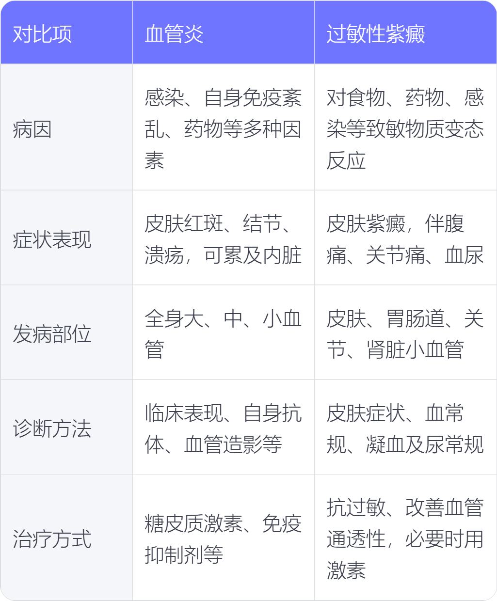 血管炎与过敏性紫癜在病因、症状表现、发病部位、诊断方法、治疗方式上存在不同。