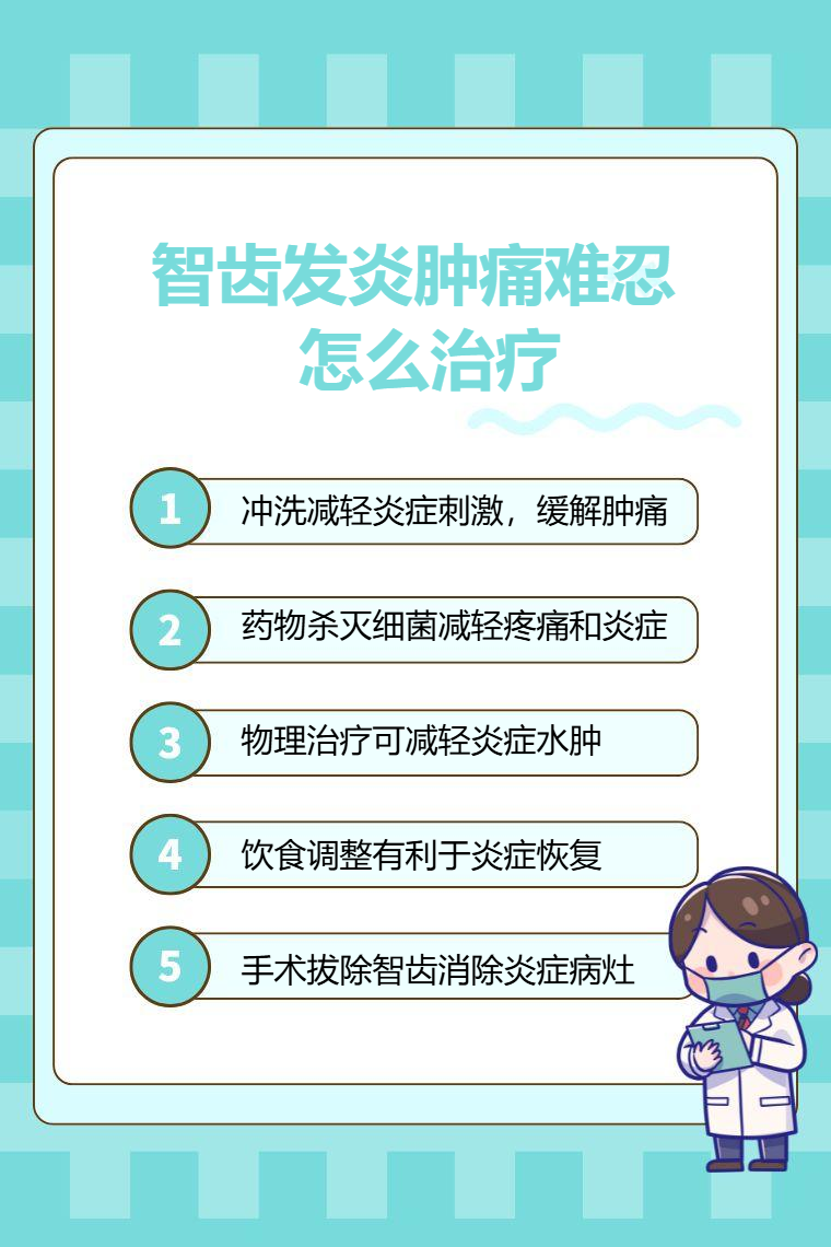 智齿发炎肿痛难忍可通过局部冲洗、药物治疗、物理治疗、饮食调整、手术治疗等方法缓解。