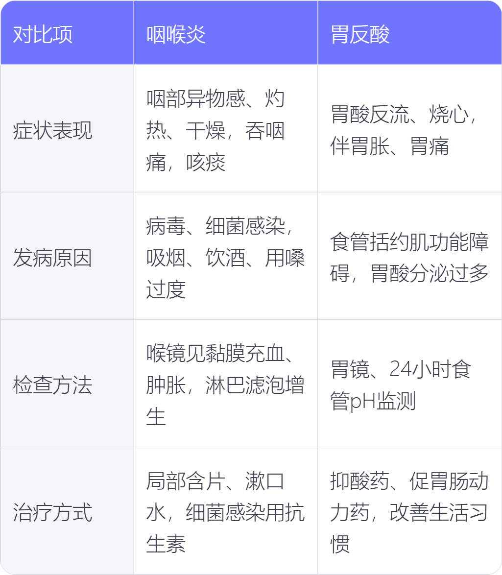 咽喉炎和胃反酸可从症状表现、发病原因、检查方法、治疗方式来区分。