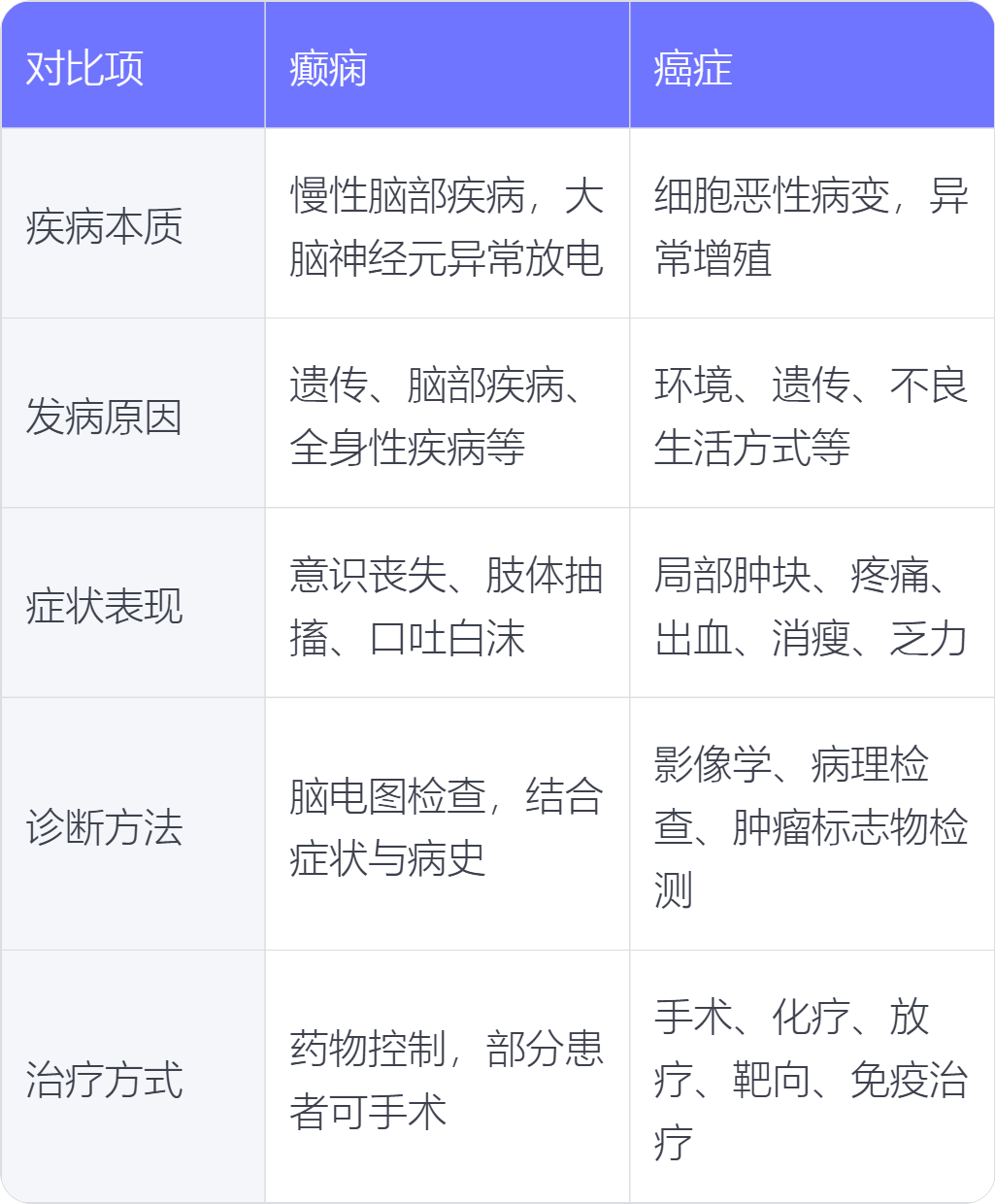 癫痫与癌症在疾病本质、发病原因、症状表现、诊断方法、治疗方式上存在不同。