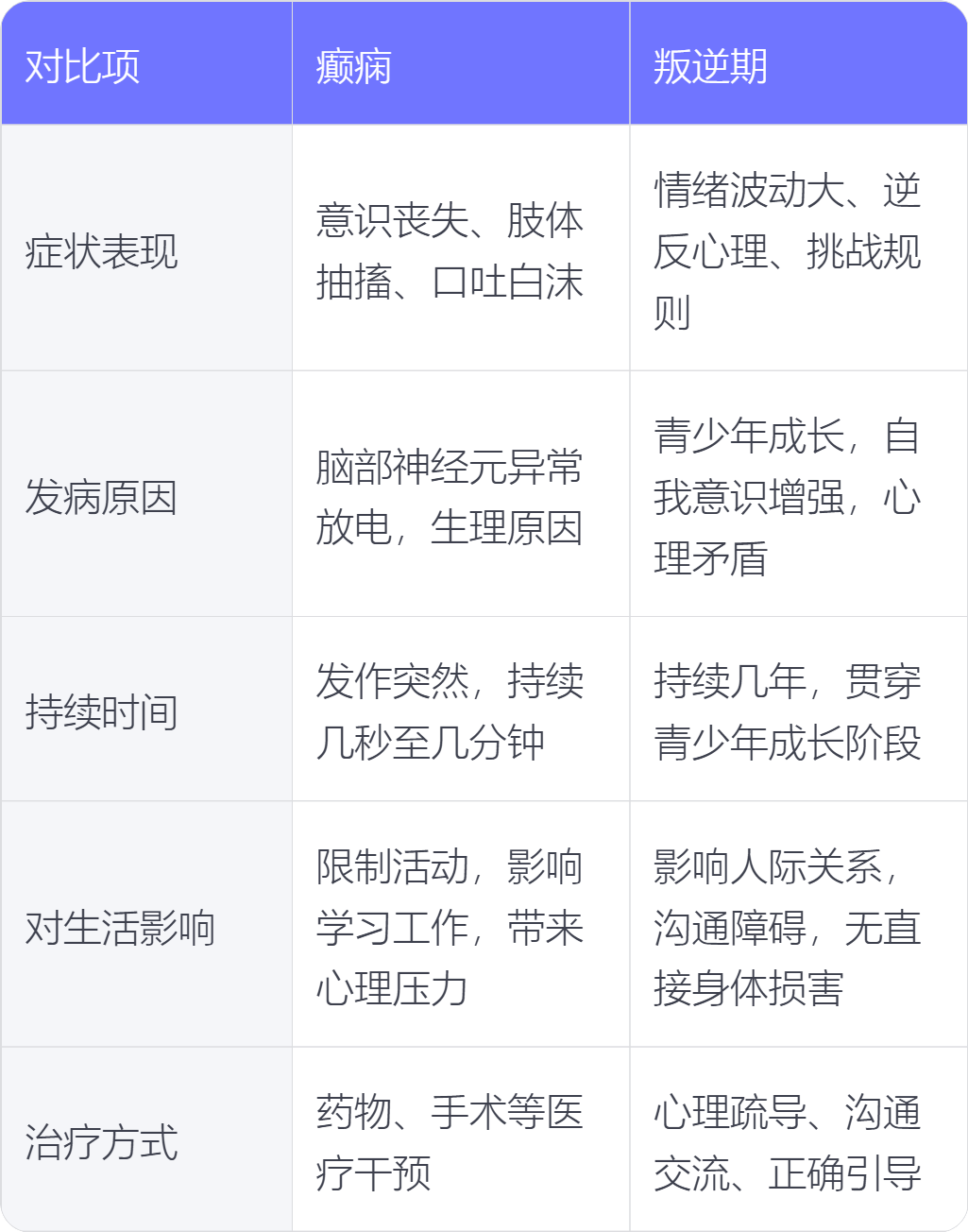 癫痫和叛逆期在症状表现、发病原因、持续时间、对生活影响、治疗方式上存在不同。