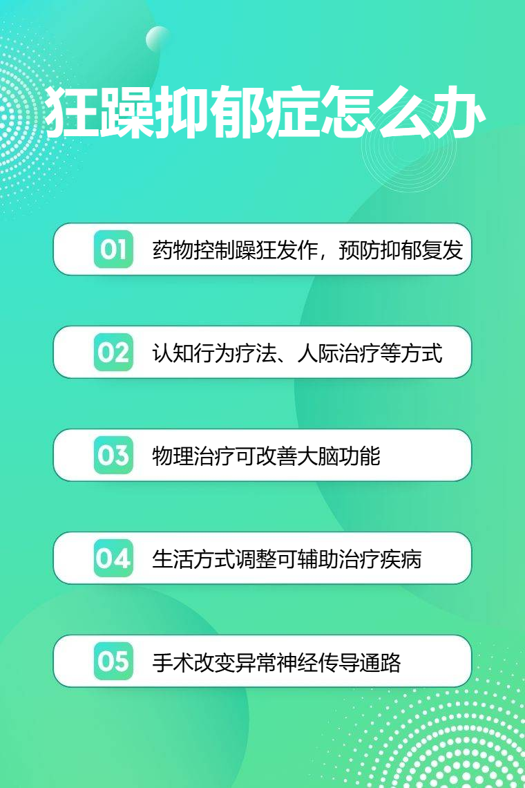 狂躁抑郁症可通过药物治疗、心理治疗、物理治疗、生活方式调整、手术治疗等方法应对。
