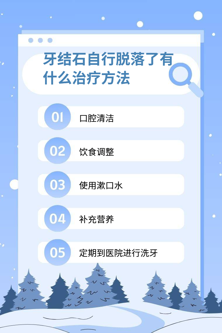 牙结石自行脱落了可通过口腔清洁、饮食调整、使用漱口水、补充营养、洗牙等方法进行治疗。