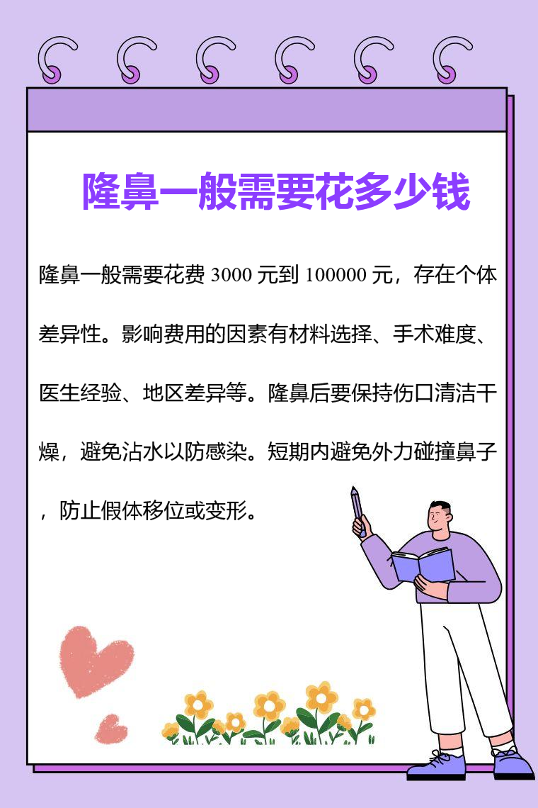 隆鼻一般需要花费 3000 元到 100000 元,存在个体差异性。影响费用的因素有材料选择、手术难度、医生经验、地区差异等。