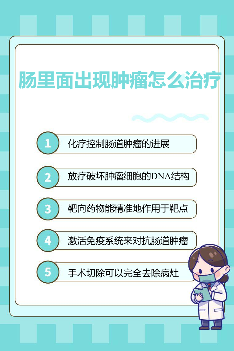 肠里面出现肿瘤的治疗方法有化疗、放疗、靶向治疗、免疫治疗、手术治疗等。